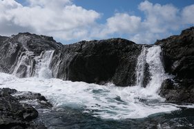 Gestern während der gesamten Wanderung nicht eine Menschenseele getroffen, heute dafür gefühlt dem Massentourismus gefrönt. Die erste Wanderung führte zu einem Felsentor, laut Wanderführer das wohl spektakulärste der Kanaren. Da ich schon recht zeitig wach war, konnte ich auch um so zeitiger losfahren zu dem ca. eine dreiviertel Stunde entfernten Ort Vega de Rio Palmas. Von hier aus ging es nun auf einem ausgetrocknetem Flussbett durch eine wunderbare Palmenoase bis zu einem ebenfalls ausgetrockneten Staudamm. Vor der Staumauer sieht man nur noch eine größere Ebene aus ockerarbener Erde. Ab da ging es entlang einer alten Wasserleitung auf Felsstufen hinab in den Barranco. Vorbei an einer weißen Kapelle, welche sich deutlich von den grauen Felsen abhob. Bald verließ ich aber den Schluchtenweg, um einen Pfad steil hinauf zu dem Felsentor einzuschlagen. Nach nicht allzu langer, aber schweißtreibenden Kraxelei stand ich davor. Natürlich nicht allein, daher musste ich etwas warten, um einen günstigen Zeitpunkt für ein paar schöne Fotos zu erwischen. Dann ging es auf dem selben Weg wieder zurück zum Auto. Dort war ich nun schon kurz nach 11:00 Uhr- viel zu zeitig, um schon wieder in das Ferienhaus zu fahren. Also fuhr ich noch ein Stück weiter ganz in den Westen zu dem Küstenort Ajuy. Hier war dann trotz des eher schlechten Wetters, bedeckt und nieselig, noch viel mehr los! Den gut ausgebauten Küstenweg säumte eine Menschentraube. Aber nun war ich mal hier, also schloss ich mich dieser an. Auf diesem Weg ging es bis zu einer imposanten schwarzen Grotte, der Caleta Negra. Von hier aus ging es nun hinauf zum Küstenplateau, allerdings nur einen eher unscheinbaren Weg. Vermutlich daher wurde es hier wesentlich ruhiger, was Menschenbegegnungen betraf. Dieser Weg führte nun bis zum nächsten Felsentor Pena Horadada. Hier gab es eine fantastische, gewaltige Brandung. Aber leider war es, wie schon erwähnt, sehr trüb und es nieselte. So gelangen mir hier nicht wirklich schöne Fotos. Nach einem kurzem Mittagssnack ging es wieder zurück und ich fuhr ins Quartier. Auch war es hier inzwischen bewölkt und windig. Aber laut Wetterbericht soll es eigentlich noch bis zum Freitag schön bleiben. Hoffentlich stimmt dieser ...