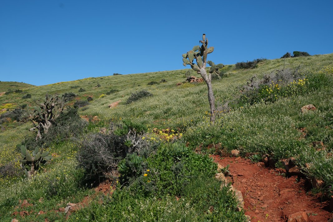 Heute Morgen sah es noch sehr trüb aus. Ein Blick in die Wetterprognose bescheinigte, dass die Wolken sich am ehesten ganz im Süden verziehen werden. Also suchte ich mir dort eine Wanderung raus. Anfahrtszeit allerdings ca. 1 Stunde und ich kam erst gegen 09:00 Uhr los. Als aber unterwegs schon die Wolken aufrissen, entschied ich mich kurzerhand um und fuhr nochmal in den Westen der Insel. Und zwar in die Nähe des Fischerdorfes Puertito de los Molinos. Warum der Ort mit nur ein paar wenigen Fischerkaten so heißt, blieb mir verborgen- denn Mühlen (Molinos) gab es hier nicht. Von dem Wanderparkplatz aus ging es aber erst einmal in ein Naturschutzgebiet, den Barranco de los Molinos. Gleich zu Anfang stand auch eine Tafel, welche darauf hinwies, dass das Gebiet ab dem 15.02. zwecks der Brutzeit gesperrt ist. Allerdings verlief der Wanderweg immer nur oberhalb des Barranco. Man kam also den Vögeln eh nicht zu nah, hatte aber wunderbare Ausblicke in diese grüne Oase. Kurz vor dem Fischerdorf senkte sich dann der Weg hinab in den Barranco und hier sah ich dann auch, das ein Weg direkt hinein verlief. Meine heutige Strecke ging aber weiter Richtung Süden an der Steilküste entlang. Dazu musste ich sogar gleich zu Anfang Hände und Füssen einsetzen, da es keinen ordentlichen Weg hoch zum Küstenplateau gab. Wahrscheinlich habe ich mir dabei noch die schwierigste Stelle rausgesucht, denn oben angekommen, sah ich einen mehr oder weniger deutlichen Pfad. Nun ging es aber wieder wesentlich angenehmer immer entlang der schroffen Küste. Heute waren die Wellen besonders rau. Teilweise schafften es diese sogar bis fast hinauf auf das Plateau, was mehrere hundert Meter sein müssen! An einer Stelle ging es auch zu einem Barranco hinunter. Dort war ein schöner, verheißungsvoller und flacher Strand. Baden war zwar viel zu gefährlich. Aber ich dachte, ein Stück reingehen wird schon möglich sein. Ich kam bis zu den Knien, dann kam eine große Welle und ich musste schnell schauen, dass ich mich noch wo festhalten konnte. Verrückt, welche Kraft diese Wellen doch haben! Also brach ich weitere Versuche ab und setzte meine Wanderung fort. Diese verlief nun bis zum Baranco de la Fuente Blanca. Wer jetzt stutzt, weil er diesen Namen schon einmal gehört hat. Ja, bis dorthin bin ich am Montag von Süden her gewandert. Mein heutiger Weg verließ nun an dieser Stelle die Küste und führte in Richtung Landesinnere. In dieser kargen, baumlosen Landschaft musste ich nun auf eine Anhöhe hinauf, was sehr schweißtreibend war. Oben angekommen, hatte man aber eine wunderbare Rundumsicht. Nur der Weitblick war nicht so gut, da es eher diesig war. Nun ging es stetig weiter, vorbei an Ziegen und einem alten, verfallenen Kalkofen, bis ich wieder bei meinem Auto angekommen war. Heute Morgen war ich der Einzige auf dem Parkplatz, jetzt standen ca. 10 Autos hier. Daher möchte ich immer so bald wie möglich mit meinen Wanderungen starten.