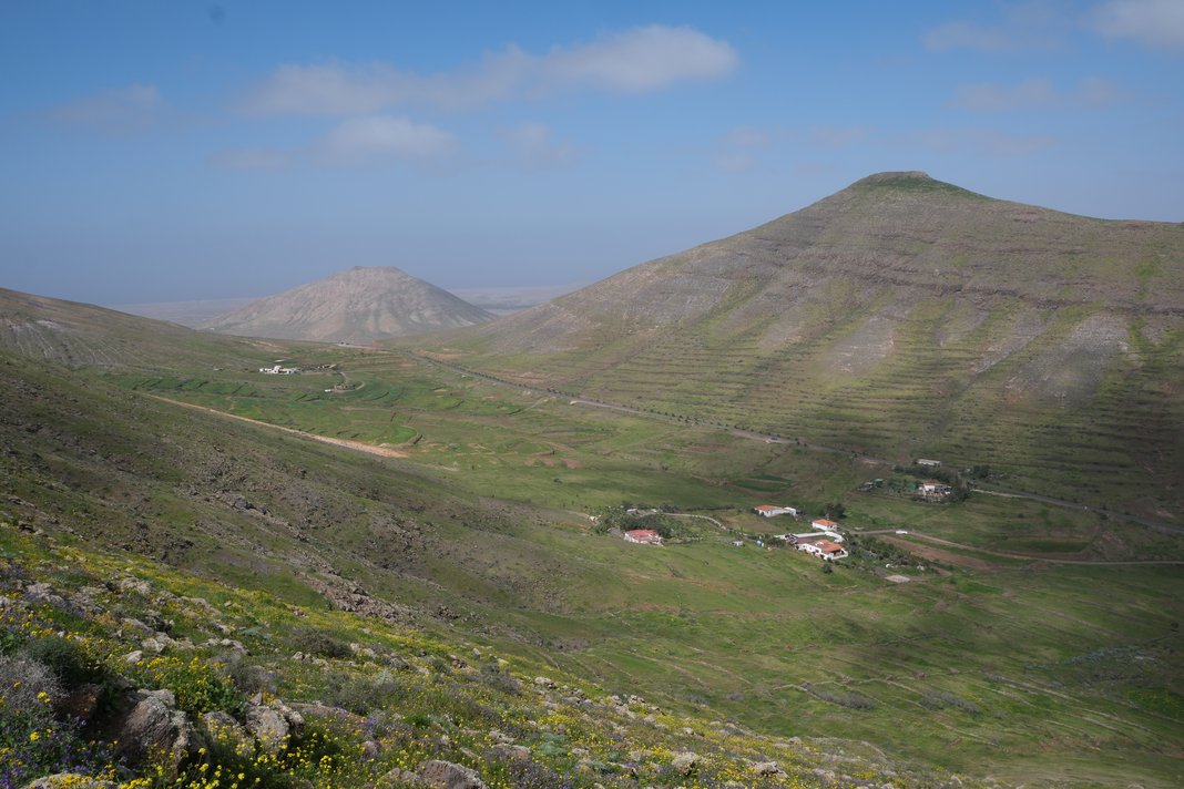 Von wegen kleine Wanderung! Am Ende war es die Längste in diesem Urlaub, ca. 18 km. Dazu musste ich nicht mal weit fahren, nur ca. eine viertel Stunde. Eigentlich begann die Wanderung erst im Ort Tindaya, doch als ich mit dem Auto durch das Dorf La Matilla kam, parkte ich schon hier. Denn der Wanderweg führte auch hier vorbei. Von hier aus ging es erst einmal wieder eine Schotterpiste hinab Richtung Tindaya. Heute begegneten mir auch mal ein paar Motocross-Maschinen, welche die staubige Piste entlang bretterten. Aber diese waren nicht mal das Problem. Viel öfter kam es vor, dass ich mich abwenden musste, um nicht den durch eine starke Windböe aufgewirbelten Staub in das Gesicht zu bekommen. Denn wenn auch den ganzen Tag die Sonne schien, der Passatwind hatte immer noch nicht nachgelassen. In Tindaya kam ich dann an der hübschen Dorfkirche vorbei und musste nun leider ein ganzes Stück auf einer Straße laufen. Irgendwann aber verließ der Wanderweg diese und führte hinauf zu einer Passhöhe mit tollem Blick auf den Berg Montana Tindaya. Dieser wird scheinbar als der heilige Berg der Ureinwohner bezeichnet. Auf dem Pass gab es auch eine Bank zum Ausruhen, aber es wehte hier oben so stark, so dass ich lieber weiterzog. Nun ging es wieder leicht bergab zum nächsten Dorf Vallebron. Auch hier hätte ich laut Wanderführer eigentlich ein Stück die Straße laufen müssen. Aber parallel zu dieser führte eine kleine Piste entlang, so dass ich lieber diese ging. Nun folgte das anstrengendste Stück hinauf zur Degollada el Renegado (502 m). Auf diesem Weg hatte man immer wieder einen fantastischen Blick in das Valle Grande, in welchem auch Vallebron liegt. Oben angekommen, sieht man eine große Sendestation, deren Antennen bei dem Wind ordentlich Geräusche machten. Nun ging es allmählich hinab zurück zum Ort La Matilla, dem Ausgangspunkt meiner Wanderung. Insgesamt war ich heute 4,5 Stunden unterwegs, was gar nicht schlecht war, denn der Wanderführer hat 5 Stunden angegeben- und das ohne Pausen und ohne Gegenwind ...