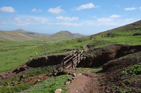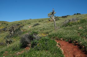 Nach einer geruhsamen Nacht und einem Müslifrühstück startete nun meine erste Wanderung. Der Ausgangspunkt, der kleine Ort Casillas del Angel, war nur ca. 10 Autominuten entfernt. Von da ging es eine Weg durch karge Landschaft allmählich aufwärtssteigend zur Degollada de la Vista de Casillas. Von hier hatte man einen wunderbaren Blick auf die nun vor einem liegende Ebene von Tefia. Nun ging es wieder hinab bis zur Ermita de San Agustin in der Nähe von Tefia, eine kleine, beschauliche Kirche mit einem sehr schönen Vorplatz. Von hier ging es einen alten Mulipfad zur nächsten Degollada de Facay. Dieser Anstieg war zwar nicht lang, aber trotzdem recht anstrengend. Oben angekommen, war es Zeit für eine kurze Mittagspause. Nun ging es in das grüne Valle de Tetir, welches ich bis zu dem kleine Weiler Cortijo de la Sargenta durchquerte. Dann ging es wieder aufwärts zur dritten und letzten Degollada de la Sargenta. Nach einer kleinen Verschnaufpause wanderte ich nun stetig bergab, vorbei an einer Olivenplantage, bis ich wieder am Ausgangspunkt nach ca. 4 Stunden und 15 km anlangte. Im Ferienhaus wurde dann erst mal ordentlich geduscht, ausgeruht und Kaffee getrunken.
