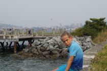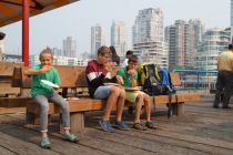 Volker meinte, es wäre gut, wenn wir wenigstens bis halb oder um 6 schlafen könnten. Mathis schlief bei mir und war schon 5 Uhr wach. Aber wir sind noch bis halb 6 liegen geblieben. Heute morgen war es draußen richtig frisch. Mann hat in kurzen Hosen fast gefroren. Wir sind dann ziemlich bald Richtung Vancouver losgefahren. Gleich zu Anfang haben wir noch Halt bei „Woods Coffee" gemacht zum kleinen Frühstück. In Vancouver selber wollten wir uns Fahrräder ausleihen. Die Parkplatzsuche zu Anfang erwieß sich aber erstmal als etwas schwierig. Obwohl der Fahrradverleih ab 09:00 Uhr offen sein sollte, war er bei unserer Ankunft um Punkt 9:00 Uhr noch zu ... Wir sind dann kurz zum Strand und Volker hat dann nochmal angerufen. Da war dann jemand da und wir konnten unsere Fahrradtour durch Vancouver starten. Die Stadt ist ziemlich gut für Fahrräder ausgebaut, so dass das richtig Spaß gemacht traf. Wir waren am KilsanoBeach, wo wir die Skyline von Vancouver bewundern konnten. Dann waren wir auf GranvilleIsland, dort gabs für die Jungs Pizza von einem Marktstand. Vorbei an der berühmten Steamclock ging es in Hintergassen entlang der Eisenbahnlinie. Irgendwann sogar durch ein Parkhaus... Vorbei am CanadaPlace ging es dann zum StanleyPark. Dort haben wir Todempole angeschaut. Auf der Westseite des Parkes waren dann Ben und Mathis im Meer. Allerdings nur kurz, da wir uns sputen mussten. Wir sind dann durch die Stadt zurück zum Verleih geheizt. Punkt 13:30 Uhr waren wir wieder bei dem Fahrradverleih. Nun ging es mit dem Auto weiter zur Fähre. Wir hatten reserviert und sollten spätestens eine halbe Stunde vor Abfahrt dort sein. Wir waren schon 1 Stunde eher da und das war gut so. Aber vor allem das Reservieren! Sonst hätten wir diese Fähre bestimmt nicht nehmen können. Massen an Autos und obwohl wir aufgrund Reservierung an vielen Autos vorbei fahren konnten, mußten auch wir ewig warten, bis es m al auf die Fähre ging. Die Überfahrt hat den Jungs viel Spaß gemacht- es ging ein richtig starker Wind, welcher aber warm war. Die Jungs sind gegen den Sturm angerannt. Und es gab noch lecker Eis. Von der Fähre runter waren wir sogar die Ersten. Nun ging es zu unserem Zeltplatz ElkFalls in der Nähe von Campbell River. Es war schon nach 19:00 Uhr. Deswegen ist Volker und Ben schnell noch Einkaufen gefahren, während Jo und ich Zelte aufgebaut haben. Mathis ist rumgeturnt. Es gab dann leckere Farfalle mit Tomatensauce, aber ohne Salz- hatten wir vergessen. Aber Parmesan drauf hat das etwas wettgemacht. Wir sind dann alle bei Zeiten ins Bett gegangen.