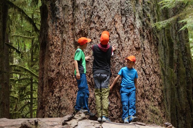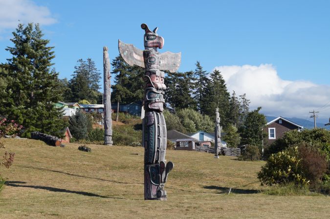 Heute morgen sind wir bei klarem Himmel erst gegen 07:30 Uhr aufgestanden. Normalerweise sollte der heutige Ausflug zum SanJosefBay ganz im Norden der Insel gehen. Unterwegs sahen wir jedoch, dass der Himmel Richtung Norden immer bewölkter wurde. Da es doch eine längere Fahrt dorthin wäre, haben wir kurz entschlossen umdisponiert und sind zum MarbelRiver gefahren und dort eine kleine Strecke zum Fluss gewandert. Der Wald dort war sehr ursprünglich und man hat noch Auswirkungen von einem Waldbrand von 1906 gesehen. Am Fluss selber haben die Jungs die üblichen Steine-ins-Wasser-Spiele gemacht. Lange sind wir aber nicht geblieben. Dann ging es noch mit dem Auto zum BeaverLake. Dort gab es einen schönen Steg zum Ausruhen. Aber erst einmal gab es Vesper. Die Jungs haben dann eine Weile gekickt. Als die Sonne mal wieder eine Weile rauskam, sind Ben, Mathis und ich auch noch ins Wasser. Volker hatte überlegt, dass wir nachmittags noch auf CormorantIsland fahren könnten. Bzw. gehen. Wir sind nämlich mit der Fähre rübergefahren, um dann zu Fuß den Ort AlertBay und vor allem das dortige FirstNation-Museum anzuschauen. Von dort zurück gab es Abends wieder mal Nudeln. Morgen würde ja eigentlich unsere 2 tägige Kayaktour losgehen. Doch Volker hat eine Mail bekommen, dass der Guide diese verschieben muss, da momentan starker Wind ist. Nun wissen wir noch gar nicht, ob das morgen überhaupt klappt ...