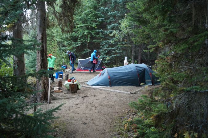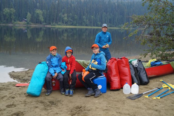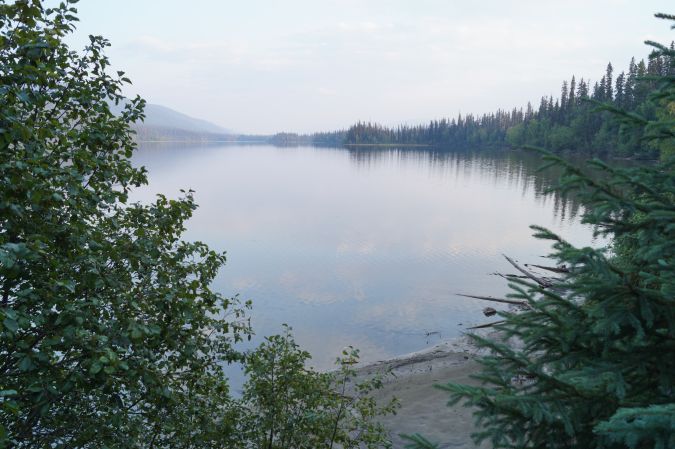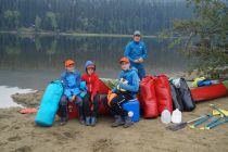 Am Freitag sind wir bei eisiger Kälte und rauen Wind aufgewacht. Zum Glück gab es auf dem Zeltplatz ein paar überdachte Unterstände. Einen davon nutzten wir gleich, um dort zu frühstücken. Dann ging es daran, alle Sachen und Proviant für die Kanutour zusammen zu suchen und in Seesäcke zu verstauen. Für die Esserei haben wir bei dem Kanuverleih eine Plastiktonne ausgeliehen. Schließlich nach Anmelden im Office des ProvincialParks incl. Einführungsvideo. Dann hieß es, Schwimmwesten anziehen und in die Kanus steigen und los geht es. Jo und Mathis fuhren mit mir und Ben mit Volker. Die erste Strecke begann mit der Überquerung des BowronLake. Und obwohl wir uns immer ziemlich in Ufernähe aufhielten, hatten wir trotzdem hin und wieder ganz schön mit dem Wind und den Wellen zu kämpfen. Aber nach ca. 2 Stunden hatten wir es geschafft. Das nächste Stück war eine längere, von Schilf besäumte, flussähnliche Übergangspassage zum SwanLake, die sich immer wieder hin und her schlängelte. Der Swan Lake selber zieht sich auch ziemlich lang hin. Da wir erst gegen 12:00 Uhr gestartet sind, haben wir nach ca. Zweidrittel des Sees einen Campground angesteuert. Dieser hatte Platz für 5 Zelte und genau 2 waren noch frei. Also haben wir diese in Beschlag genommen, Zelte aufgebaut und Essen gekocht. Letzteres war etwas mühsam, da es hier nicht so schöne Sitzplätze gab. Also mußten eine provisorische Bank und Holzstumpen ausreichen. Nach ein, zwei Runden Rage endete der erste Tag in der „Wildnis".