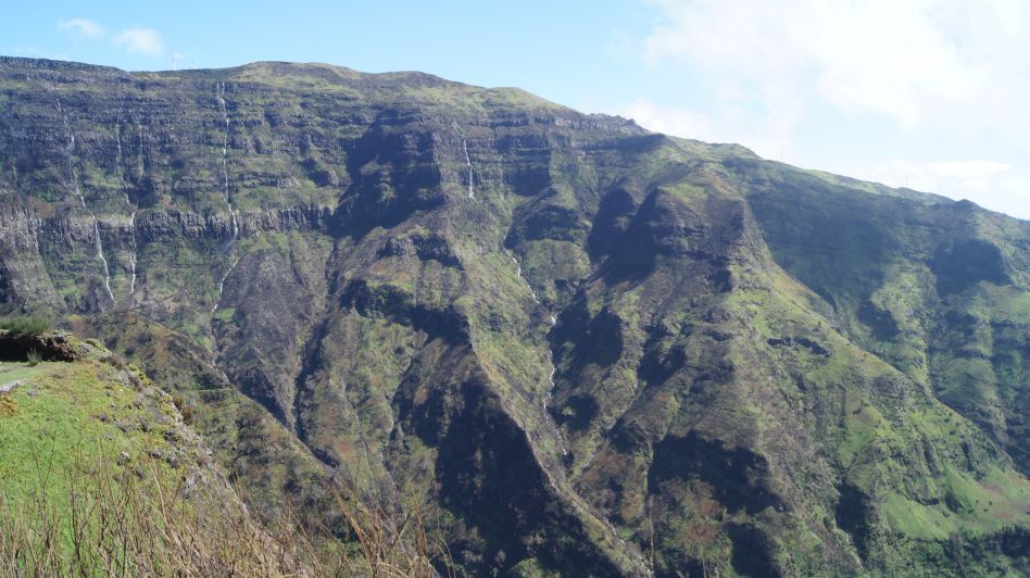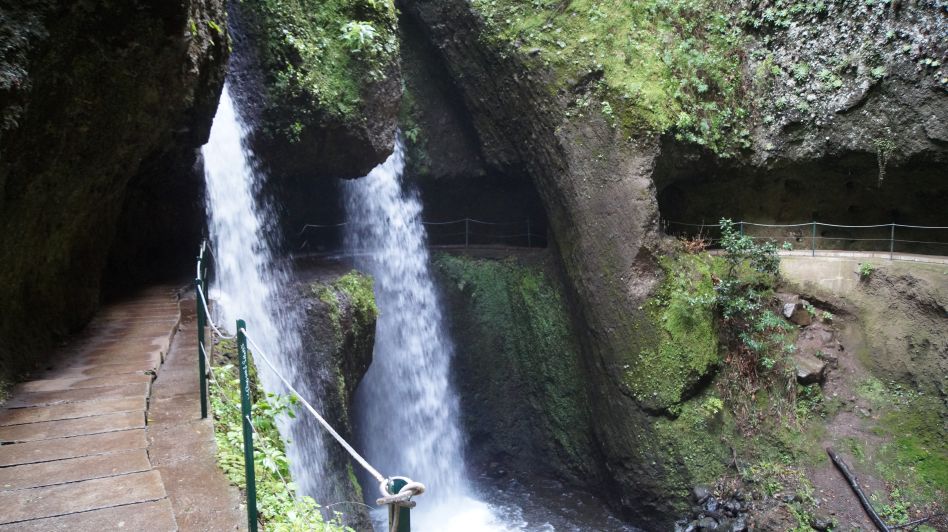 Eigentlich wollte ich heute einen Ruhetag einlegen, denn es war nur für Nachmittags gutes Wetter vorhergesagt. Also habe ich es morgens noch ruhig angehen lassen. Doch irgendwann habe ich mir doch überlegt, nochmal aufzubrechen. Und zwar an die gleiche Stelle, wo ich am Freitag erst hinwollte. Von hier aus gehen gleich 3 Wanderungen los. Ich hatte mich anfangs für die kürzeste entscheiden, ca. 2,5 Stunden Wegzeit. Als ich loslief, hat es immer noch leicht geregnet und man hat aufgrund des Nebels keinerlei Weitsicht gehabt. Nach ein paar Minuten kam ich jedoch an eine Stelle, bei welcher ein reißender Bach die Levada mit ziemlicher Wucht überschwemmte. Also drehte ich um und entschied mich für die Wanderung in den Cascalho. Anfangs verlief diese noch bequem entlang einer Levada. Irgendwann jedoch ging es auf einem Karrenweg abwärts. Aufgrund der ausgiebigen Regenfälle wurde dieser jedoch immer wieder auf meiner Wegstrecke überflutet. Anfangs war das kein Problem, da meine Wanderschuhe das Wasser gut abhielten. Nach einem alten Haus jedoch ging es durch einen Tunnel und direkt davor ergoss sich ein kleiner Wasserfall. Und alles Wasser, also jenes, was schon vom Weg aus kam und das aus dem Wasserfall floss ebenso durch den Tunnel. Da lies es sich nicht mehr verhindern, dass auch mal das Wasser oben in die Schuhe eindrang und ich pitschnasse Socken bekam. Nach dem Tunnel und einer kleinen Linksbiegung breitete sich jedoch der Kessel des Cascalho vor mir aus. Auch wenn es immer noch bedeckt war, war das beeindruckend- dieses riesige Felsenmassiv, von welchem aus etliche Wasserfälle herunterstürzten. Man hätte noch ein kleines Stück weitergehen können, aber auch hier flutete ein Wasserfall den Weg. Da mir nasse Füße reichten, bewunderte ich noch eine Weile die Szenerie und drehte wieder um. Nicht allzu lang später schaffte es sogar die Sonne noch, den Nebel zu vertreiben und bescherte mir noch ein paar schöne Blicke in das Tal.