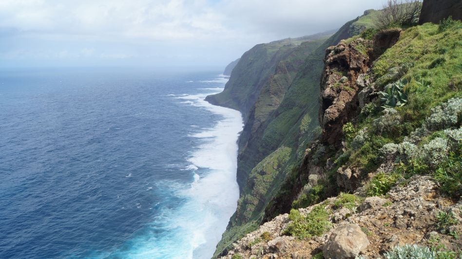 Die ganze Nacht hat es heftig gestürmt und geregnet. So sehr, dass ich Ohropax benutzen musste, um schlafen zu können. Grund war die Außenklappe der Dunstabzugshaube, welche immer wieder geklappert hat ... Auch heute Morgen sah es noch ziemlich trübe aus und die Vorhersage war eher durchwachsen. Daher habe ich mir nur eine eher kleine Wanderung im Nordwesten der Insel rausgesucht. Startpunkt war der Ort Achadas da Cruz. Von hier ging es entlang der Levada do Moinho bis zur Ihrer Quelle. Es regnete zwar nicht, aber anfangs war es total neblig und es wehte ein unangenehmer Wind. Die Levada führte durch ein Waldgebiet, wo es irgendwann einmal gebrannt haben musste. Viele Bäume waren schwarz und verkrüppelt. Das mutete bei dem Nebel noch bizarrer an. Bei der Feuchtigkeit, die hier aktuell herrschte, kann man sich gar nicht vorstellen, dass es hier mal brennen konnte. Der Kanal war oft randvoll mit Wasser und teilweise trat dieses sogar über und überflutete den Weg daneben. Und auch hier tropfte von den moosbewachsenen Felsen stetig Wasser in den Kanal. Nach Überquerung einer Stelle, welche mal wieder von einem Wasserfall überflutet war, kam ich nach ca. 1,5 Stunden an der Quelle an, eine Stelle wie in einem Märchenwald! Nachdem ich dann bei meinem Rückweg an der Abzweigung zum Ort anlangte, ging ich die Levada noch ein Stück in der anderen Richtung entlang. Allerdings nur bis zu einer Stelle, wo dann über eine größere Distanz der Weg komplett überflutet war. Dann kehrte ich endgültig um und begab mich zu meinem Auto. Immerhin waren es dann trotzdem 10 km. Auf der Rückfahrt machte ich noch einen Abstecher zum Leuchtturm am Ponta do Pargo. Von hier hat man eine super Aussicht auf die Steilküste im äußersten Westen der Insel. Zum Glück hatte ich einen guten Moment erwischt, denn gerade als ich wieder von hier aufbrach, fing es an, zu regnen. Bei Madalena do Mar machte ich noch einen weiteren, kurzen Halt. Hier ist man ganz dicht am Meer und die Brandung war ziemlich beeindruckend. Dann ging es aber wirklich ins Quartier.