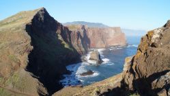 Heute wurde mein Tagesplanung leider komplett über den Haufen geworfen! Eigentlich war mein Ziel die Halbinsel Sao Lourenco am östlichsten Ende von Madeira. Da dieser Ort ein totales Touristenmagnet ist, sollte man schon möglichst zeitig dort sein, um es beim Wandern einigermaßen ruhig zu haben. Also bin ich schon um 06:30 Uhr aufgestanden. Nach einer Fahrt von ca. 50 Minuten war ich gegen 08:15 Uhr schon dort. Ein paar Autos standen schon, aber noch überschaubar. Als ich dann aber zum Wanderweg gehen wollte, musste ich mit Entsetzen feststellen, dass dieser gesperrt war! Ein Polizist bewachte das sogar und sagte irgendwas von wegen Wind ... Allerdings war es weder stürmisch, noch schlechtes Wetter. Aber was soll's, später habe ich hier in dieser Übersicht entdeckt, dass alle Top-Touren zur Zeit geschlossen sind! Nun musste ich also kurzfristig umplanen und habe mir eine Route noch etwas weiter nördlich bei dem kleinen Ort Curtado de Santana rausgesucht. Von hier ging es mal nur kurz eine Levada entlang und dann immer steil bergab zu der Landzunge namens Ponta do Clerigo. Das letzte, kleine Stück bis zu einer Felsnase habe ich mich dann aber nicht getraut, zu klettern. Aber man hatte von hier eine phantastische Sicht auf die Küste und das Wetter war wirklich super. Was ich dann aber auch bei der Rückkehr bergauf schweißtreibender Weise bemerken musste. Auch wenn sie sich geloht hat, war es trotzdem nur eine kleine Wanderung mit ca. 6 km, 400 hm einfach und Zeit inklusive Pause von 2,40 Stunden. Also war ich schon so gegen 12:00 Uhr wieder am Auto und entschloss mich kurzerhand, noch eine weitere Wanderung durchzuführen. Zu dieser waren es so ca. 20 Minuten Fahrtzeit in den Weiler Cruz. Von hier ging wieder einmal eine Levada-Wanderung los, und zwar in das Tal der Ribeira de Sao Roque. Das war jetzt aber wirklich mal eine richtig schöne und entspannte Wanderung durch wunderbare Natur. Nach etwa 1,5 Stunden war ich am Ziel, der Quelle der Levada do Castelejo. Doch man kam nach Umgehung eines großen Felsens durch den Fluss, in dem man von Stein zu Stein hangelte, noch weiter zu einer sehr schönen Stelle mit Hängebrücke und etwas angestautem Flussbett. Über die Hängebrücke könnte man wohl noch weiter wandern Richtung Lombo Grande. Ich jedoch machte hier Rast und hüpfte auch mal ganz kurz in das kalte Wasser. Danach wanderte ich total erfrischt wieder zurück. Diese Wanderung war ca. 12 km lang und ich war inkl. Pause 3 Stunden unterwegs. Zurück am Auto reichte es mir aber für heute und es ging zurück zum Quartier. Hier zogen dann wieder dicke Wolken auf und es stürmt und regnet seitdem.
