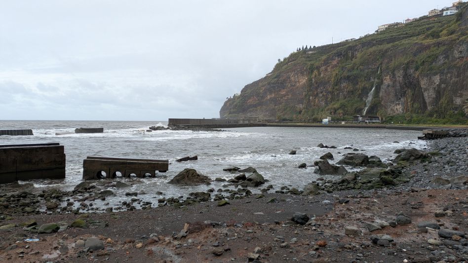 Und leider wieder ein weiterer, verregneter Tag ... Den ganzen Tag hat es gestürmt und oft auch geregnet! Erst gegen 16:30 Uhr kam heute mal die Sonne raus- nun ist fast keine Wolke mehr zu sehen, aber nach wie vor sehr stürmisch. Daher auch heute keine großartige Wanderung, sondern nur ein Kurzausflug zum Nachbarort. Genauer gesagt zum Port Lugar de Baixo. Scheinbar sollte hier ein Sportboothafen inklusive Freizeitzentrum entstehen. Doch das Meer hat dem Projekt wohl einen Strich durch die Rechnung gemacht. Wahnsinn, was für massive Betonklötze von der Brandung wie Lego durcheinander geworfen wurde! Hier sieht man, wie es mal aussah ... Ja, und das war es dann auch schon weitgehend für heute, nochmal ein kleiner Spaziergang im Ort, gelesen usw. Und morgen geht schon früh der Flug zurück nach Stuttgart.