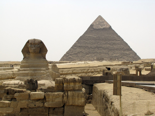 Bevor man zum Haupteingang kommt, waren unterhalb dessen die Fußwege abgesperrt, so dass man kurz auf die Straße musste. Doch vorher bin ich von einem Mann links auf einen Platz gelotst wurden mit der Begründung, hier wäre der Eingang. Bald sah ich aber auf dem Platz ein flaches, verfallenes Gebäude und lauter einfache Pferdekutschen drum rum. Da war mir klar, dass er mir so eine Fahrt andrehen wollte. Daraufhin machte ich schnurstracks wieder kehrt. Er versuchte zwar, mich noch umzustimmen mit dem Hinweis auf die langen Wegstrecken zwischen den Pyramiden. Aber ich lies ihn einfach stehen. Bei den Ticket's die nächste Story. Ich verlangte ein Ticket für die Pyramiden und bekam eines für 100 pounds. Machte mich zwar erst stutzig, da ich was von 60 gelesen hatte. Aber kann ja teurer geworden sein. Am Eingang dann wurde mir erklärt, dass ich anstatt ein Ticket für den Gesamteintritt ein Ticket für den Eintritt in die Cheops-Pyramide gekauft hätte. Also nochmal zahlen und zwar die 60 pounds. Eigentlich hätte ich das andere Ticket zurückgeben sollen, da ich auch schon gelesen hatte, dass sich das Innere der Cheops-Pyramide nicht wirklich lohnen soll- was sich dann auch bestätigte. Aber wie das so ist in dem Moment, sagt man sich, was solls. Und genau damit rechnen die. Im Gelände wird man dann gleich angesprochen, dass man sein Ticket vorzeigen soll. In dem Moment denkt man auch, die gehören hier her. Der Typ will mich dann gleich irgendwo langführen und ich merke, der ist auch bloß auf mein Geld aus. Habe ihn stehen lassen und mir dann als erstes die Cheops-Pyramide angeschaut. Diese ist die größte der drei Pyramiden. Schon gigantisch, wenn man am Fuße dieser Pyramide steht. Dann gings hinein. Vorher musste man eigentlich noch seine Kamera abgeben. Aber da hatte ich auch gelesen, dass ein kleines "Bakschisch" (Trinkgeld) helfen kann. Und tatsächlich, für 5 pounds durfte ich meine Kamera mit hineinnehmen. Bald ging es ziemlich steil und eng (1m Raumhöhe) einen Gang nach oben, später nochmal einen zweiten Gang, dessen Decke aber sehr hoch war. Und dann war man in einem Raum, ca 5 x 11 m und in einer Ecke eine leere Granitwanne. Hier drin ist es dunkel, sehr heiß und stickig. Dies ist also die Königskammer mit dem Sarkophag. Naja, im Internet liest sich das interessanter, wie es dann aussieht. Wieder draussen angekommen, ging es weiter zu der Chephren-Pyramide. Diese hat an der Spitze einen kleinen "Überzieher", Reste einer Kalksteinverkleidung. Unterwegs hat mich dann ein Kameltreiber angesprochen. Ich sollte doch ein Bild von ihm machen. Aber da wusste ich auch schon, dass sie dann dafür Geld wollen. Dummerweise habe ich mich aber auf ein Gespräch eingelassen, er hat mich auch wieder rumführen wollen. Um meine Ruhe zu haben, gab ich ihm dann 5 pounds. Dies sah ein Uniformierter und sagte mir dann, dass dies nicht gut ist. Allerdings hat mich später wiederum ein anderer Uniformierter selber um ein wenig Geld gebeten ... Eigentlich wollte ich auch in diese Pyramide, allerdings kostete das wieder extra Eintritt, so dass ich das erstmal ließ. Nun ging es weiter auf dem alten Prozessionsweg von der Chephren-Pyramide zur Sphinx. Direkt ran kommt man allerdings nicht. Sie ist eingezäunt. Nichts desto trotz ist auch sie ein imposantes Bauwerk. Nachdem ich noch über den östlichen Friedhof gegangen bin, der aussieht wie lauter kleine verfallene Pyramiden, reichte es mir aber auch. Es war schließlich auch wieder ziemlich warm, 34° und keine Wolke am Himmel. Die Pyramiden zu sehen hat sich auf jeden Fall gelohnt. Allerdings als fader Beigeschmack sind die vielen Einheimischen auf dem Gelände, die nur an dein Geld wollen und genau so die Verwaltung zu nennen. Viel Bemühungen um Erhaltung und Pflege der Anlagen lies sich nicht erkennen.