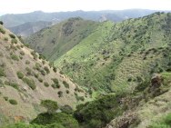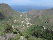 Zu meiner heutigen Wandertour hatte ich eine etwas längere Anfahrt. Der Ort heißt Hermigua und liegt im Nordosten von Gomera. Eine Stunde habe ich gebraucht, bis ich dort war. Nur leider fand ich nicht gleich den Startpunkt, wie er im Wanderführer beschrieben war. Also musste ich nach einigem Rumsuchen Einheimische fragen- auf spanisch natürlich. Dadurch fand ich dann schnell den Startpunkt und es konnte losgehen. Natürlich gleich erstmal wieder Ewigkeiten bergauf im Barranco del Cedro. Obwohl der Himmel auch hier wieder anfangs bedeckt war, schwitzte ich bald, was das Zeug hält. Meine Kappe musste ich heute Abend erstmal waschen. Dank "Rei in der Tube" aber kein Problem. Bald hatte ich wieder grandiose Aussichten auf Hermigua und irgendwann auch auf den höchsten Wasserfall der Insel. Leider kam ich an diesen nicht direkt ran. Ich glaube aber nicht, dass es da überhaupt einen Weg hin gibt. Nach 1,5 Stunden kam ich am einzigen Campingplatz der Insel, La Vista vorbei. Nun ging es aber im Cedro-Wald weiter bergauf bis auf 1030 m. Von hier aus ging es nun im gemütlichen auf und ab eine Forststraße entlang bis zu dem Weiler Los Acevinos, an dessen Kapelle ich meine Mittagspause einlegte. Nun ging es auch schon wieder bergab und ich hatte wieder phantastische Aussichten auf Hermigua und auf die Ermita de San Juan. Anfangs noch ein kleiner Fleck, doch irgendwann stand ich vor ihr. Nun ging es noch eine Weile im Ort bergab, bis ich auf die Hauptstraße traf, von der aus ich in einer viertel Stunde wieder am Auto war. Nun aber mal eine Bemerkung zu den Tieren hier, genauer gesagt, zu den Hunden. Eigentlich mag ich ja Hunde. Doch irgendwie denkt hier jeder Hund von kleiner Tölle bis ausgewachsenem Riesenvieh, einen anbellen und anknurren zu müssen. Und dazu laufen diese meistens in der Nähe von ihrem Zuhause frei herum. Bei so kleinen Hunden macht das ja nix weiter, ein beherzter Schritt auf sie zu, und sie ziehen den Schwanz ein. Aber heute z.B. bin ich an einem Haus vorbei und hörte schon wieder das Gekläffe. Sah aber ein Gartentor und dachte, gut so, der Hund ist doch etwas größer. Gerade zu Ende gedacht, schwupps, war der Köter unter dem Tor durchgeschlüpft und rannte auf mich los. Da musste ich erstmal wieder laut werden, damit er begriff, wer der "Herr im Hause" ist :-). O.K. nun wieder zur Statistik: 15 km zurück gelegt bei einer Zeit von 5 Stunden und 850 Höhenmeter.