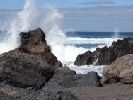 Heute habe ich es dann aber wirklich mal ruhig angehen lassen. Bin früh nach Alojera gefahren, ein kleiner Ort im Westen der Insel. Von dort wanderte ich eine kleine Strecke zu dem abgelegenen Strand Playa del Trigo. Wenn jetzt einige meinen, ein Dejavu haben, dann muss ich euch Recht geben. Hier war ich schon im letzten Urlaub. Allerdings hatte es damals schon bald angefangen zut regnen. Diesmal konnte ich es richtig lang genießen, obwohl es sich auch wieder gegen 12.00 Uhr eintrübte. Aber es war trotzdem schön warm und es gab keine Regenwolken. An Schwimmen war zwar nicht zu denken, da es sehr felsig war und die Brandung war auch nicht ohne. Aber im Wasser gegen die Brandung ankämpfen, die Gischt ins Gesicht gespritzt zu bekommen, hat ja auch was. Lustig war auch, dass dort jemand eine kleine provisorische Hütte mit Sessel und so gebaut hatte- also falls es doch wieder geregnet hätte .... Ansonsten halt wieder lesen und faulenzen. Rückzu wollte ich nicht wieder den gleichen Weg gehen. Deswegen versuchte ich es in dem Barranco del Trico. Irgendwann musste ich diesen verlassen und kletterte über Terassenfelder, welche voller komischem Distelgestrüpp waren. War nicht so angenehm. Bald aber stieß ich auf einen Pfad, der mich zu einer Piste Richtung Alojera führte. In Valle Gran Rey wieder angekommen, kaufte ich erst einmal im Spar wieder Lebensmittel ein. Man muss ja auch was essen!