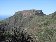 Meine heutige Wanderung führte mich auf den höchsten Punkt der Insel, den Garajonay. Das Auto parkte ich in dem Weiler Pavón, nahe Chipude. Von dort aus ging es erstmal auf die Fortaleza, eine riesige Felserhebung mit großartigen Aussichten. Anfangs ging es dorthin noch ganz gemütlich einen serpentinenartigen Pfad hinauf. Doch am Fuß der Fortaleza-Felswand wurde es zu einer Kraxelei bis zu einem Nebengipfel, von dem aus es ziemlich luftig zur eigentlichen Hochfläche ging. Eigentlich dachte ich, einigermaßen schwindelfrei zu sein. Doch hochzu war ich manchmal ganz schön unsicher und musste oft tief durchatmen. Dabei musste ich auch immer an den Rückweg denken, wie der sich erst gestalten wird. Aber irgendwann oben angekommen, hatte ich eine super Aussicht auf die Umgebung. Und der Rückweg war dann doch irgendwie ziemlich einfach. Zu meiner Genugtuung war dieser Ausflug im Wanderführer auch als schwierig eingestuft. Nun ging es gemütlich weiter immer am Rand eines Hanges entlang mit wunderbaren Aussichten auf die Fortaleza. In Igualero führte mein Weg in einem Kiefernwald hinauf Richtung Garajonay. Dort angekommen, machte ich erstmal eine Pause und genoß die Rundumsicht. Obwohl die Fernsicht nicht so toll war (diesig), konnte man ganz gut Teneriffa und den Teide sehen. Die anderen Inseln verblasten eher im Dunst. Aber auch von hier wieder die Aussicht auf die Fortaleza- diesmal fast eine "Draufsicht". Nun ging es wieder bergab, irgendwann am Weiler Los Manatiales vorbei, Richtung Chipude und von da zum Ausgangspunkt. Zurückgelegte Strecke 14 km bei einer Zeit von 4,5 Stunden (wie immer incl. Pause).