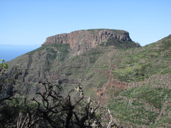 Oh mann, bin ich fertig, fix und fertig!! Die heutige Wanderung ha es in sich gehabt, hat mich total geschlaucht. Aber von Anfang an: Los ging es an der Kreuzung Degollada de Peraza. Hier kreuzen sich die Straßen nach Playa de Santiago und San Sebastian. Also ziemlich im Osten der Insel. Fahrtzeit dahin dreiviertel Stunde. Mein Weg verließ aber gleich die Straße und führte am Fuß einer Anhöhe entlang. Von weitem sah ich in einer Kurve solche großen Stromkabeltrommeln, ihr wißt schon, solche Holzdinger. Als ich näher kam, was passierte? Na klar, 2 Hunde waren an diesen angekettet und bellten und sprangen rum wie verrückt, als sie mich sahen. Nun war der Weg sehr schmal, also an den Hunden vorbeikommen, ohne ihnen gefährlich nahe zu kommen, war aussichtslos. Toll!! Und das gleich am Anfang. Also drehte ich um und ging über die Anhöhe einen kleinen Umweg. Bald hatte ich aber jegliche Zivilisation hinter mich und kam am Fuße des Roque del Sombrero vorbei. Nun ratet mal, wieso der so heißt. Kleiner Tip: Bild des Tages anschauen ;-). Unterwegs begegnete ich einem Ehepaar aus der Schweiz. Diese hatten bis nach Morales die selbe Strecke vor sich. Dann bogen Sie ab Richtung Playa de Santiago. War ganz gut, da wir uns teilweise bei der Findung der Wegstrecke beraten konnten. Vor allem an einer Stelle haben wir eine ganze Weile überlegt. Und apropo Hunde, als ich Ihnen erzählte, wie mich die Hunde hier so behandeln, haben Sie sich nur gewundert. Bei Ihnen würden die Hunde immer auf Abstand bleiben. Also liegt es an mir!! Aber wieso?!