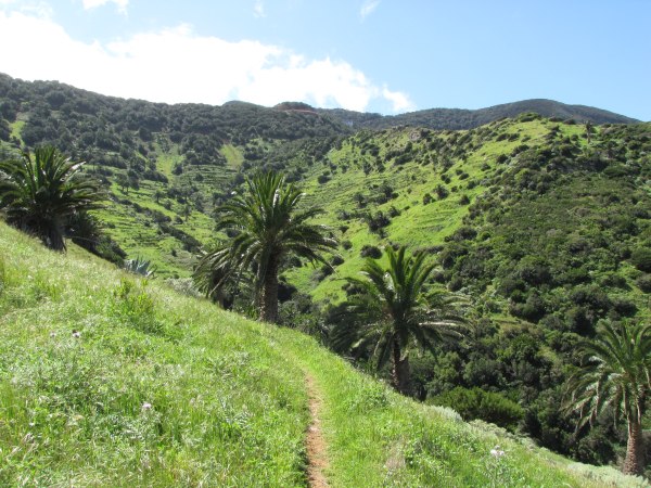 So, das war nun meine letzte Wanderung heute. Morgen muss ich noch mal ausruhen. Heute ging es in den Barranco de Guarimiar. Startpunkt war der kleine Ort Imada, nördlich von Alajero. Insgesamt eher im Süden der Insel gelegen. Von Imada ging es gleich in den Barranco hinab. Erst ein liebliches, von Terassen geprägtes Hochtal, bald eine von mächtigen Felswänden flankierte Schlucht. Der Weg verlief manchmal von weitem gesehen schon sehr knapp am Abgrund, war jedoch immer breit genug. Das erste Etappenziel war der Weiler Guarimiar. Von hier aus könnte man auch weiter bis hinunter nach Playa de Santiago. Doch mein Weg führte wieder hinauf. Und wieder einmal steil in Serpentinen wand sich der Weg nach oben. Unterwegs begegneten mir immer mal wieder ein paar Bergziegen. Zumindestens haben diese aber Respekt und bellen nicht ;-). Am Gipfel angelangt, war ich in Targa. Von dort aus ging ich erstmal die Straße nach links zu einem Vermessungspunkt, von dem aus man eine schöne Sicht auf Santiago und den einzigen Flugplatz der Insel hat. Dort machte ich dann auch gleich meine Mittagspause. Und sah meine Altersresidenz! Ein Grundstück wunderschön abseits gelegen, einfach perfekt. Wieder zurück ging es zum nächsten Ort Alajeró. Dort musste ich dann ein ganzes Stück Straße laufen. Nun wäre es eigentlich auch schon wieder Richtung Imada gegangen. Aber ich beschloß noch am größten Drachenbaum Gomeras vorbei zu schauen. Dorthin ging ein Pflasterweg, zwar auch steil hinab, aber gut ausgebaut. Dieser Baum ist nämlich eine Touristenattraktion. Deswegen hat man ihn leider auch vor ein paar Jahren eingezäunt, so daß auf den Fotos immer dieser blöde Zaun mit zu sehen ist. Nun ging es aber wieder zurück nach Imada. Heute war ich 5 Stunden unterwegs und habe 14 km zurückgelegt.