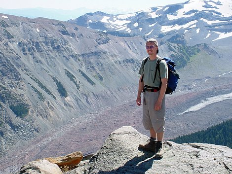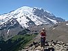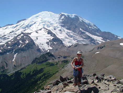 Die Nacht war ganz gut, früh war es etwas kalt. Nach dem Frühstück gings dann um 10.00 Uhr los auf unsere Wanderung (Start bei 1341 Höhenmetern). Ziel waren die Second Burroughs, von denen aus man einen genialen Blick auf den Mt. Rainier haben soll. Der Weg dorthin war beschwerlich, wir haben ca. 900 Höhenmeter zurückgelegt. Aber er war auch wunderschön, anfangs oft durch Wald, immer wieder einen Bach überquerend und auch immer wieder den Blick auf den Berg freigebend. Um so höher wir kamen, um so weniger Bäume und um so näher rückte der Mt. Rainier mit seinen schneebedeckten Gipfeln und Gletschern. Bis zum Ziel waren es ca. 8 km. Damit wäre die Hälfte geschafft gewesen. Wir sind jetzt auf einer Höhe von 2245 Metern. Es hat sich wirklich gelohnt, der Berg ist zum Greifen nahe. Absolut beeindruckend. Da aber Soni mit ihrem Ball im Bauch und ich mit meinem Haxen nicht nochmal soviel laufen wollten, haben wir uns getrennt. Volker und Ingolf sind den Weg zum Zeltplatz gelaufen und Soni, ich und Jonathan (auf mir) sind die kürzere Strecke ( 3,4 km) zum Sunrise Visitor Center gelaufen. Da Jonathan erst die letzten 5 min. eingeschlafen ist, mußte ich ihn noch eine Weile in der Trage behalten. Volker und Ingolf kamen uns dann mit dem Auto abholen. Nun sind wir grad auf der Fahrt nach Hause, alle sind fertig und müde, sogar Volker. Nur einer wieder mal nicht, Jonathan!!