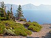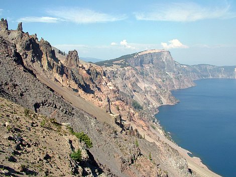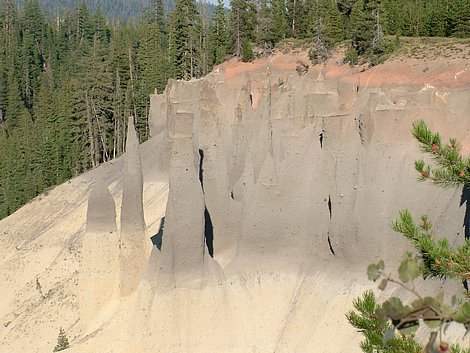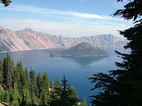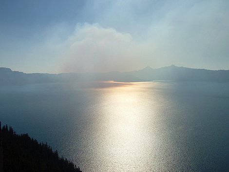 Heute morgen hieß es Abschied nehmen von den "Raben". Ingolf hat noch schnell den Eintrag ins Gästebuch übernohmen. Um ca. 10.00 Uhr sind wir dann losgefahren. Ich war schon etwas traurig. Wer spielt jetzt mit mir Eisenbahn? So, da wir keine genaue Karte von Oregon hatten, verließ ich mich voll auf meinen PDA. An sich auch wirklich kein Problem, als aber die erste Schotterstraße kam, wurden wir stutzig. Irgendwann waren es nur noch solche Straßen mitten durch den Wald voll über die Berge. Ingolf wurde es langsam mulmig, ob wir hier je wieder rauskommen. Das Auto tat mir auch ziemlich Leid, hoffentlich liest nicht Hertz meine Homepage. Aber irgendwann kamen wir wieder auf befestigte Straßen und die Richtung war auch richtig. Waren dann gegen 15.45 am Crater Lake. Ich schätze mal, wir haben dadurch eine dreiviertel Stunde verloren. Zur Navigation mit dem PDA ist mir irgendwann noch eingefallen, dass ich anstatt schnellste Route die kürzeste hab berechnen lassen. Meine Güte, keiner ist perfekt ;-)! Am Crater Lake dann gleich am ersten Viewpoint haltgemacht und .... Enttäuschung! Total diesig, kaum Sicht und von wegen tiefblaues Wasser. Auf dem Weg zum Watchman, ein Aussichtspunkt, sahen wir den wirklichen Grund - Waldbrand! Eine riesige Rauchwolke zog immer genau auf den See. Wir sind dann trotzdem den Rim Drive in Uhrzeigerrichtung gefahren und haben bei ein paar Stellen halt gemacht. Trotz oder gerade wegen der schlechten Sicht war es doch eine merkwürdige Stimmung auf dem See. Wer hat den Crater Lake denn schon mit einer Rauchwolke gesehen. Dann sind wir Richtung Pinnacles abgebogen. Unterwegs war ein Zeltplatz, auf dem wir eigentlich übernachten wollten. Wir waren ca. 18.00 Uhr dort. Leider war alles voll, er war auch sehr klein. Haben uns trotz der fortgeschrittenen Zeit entschieden, noch zu den Pinnacles zu fahren. Das hat sich dann auch wirklich noch gelohnt! Spitze turmartige Felsen aus gehärteter Vulkanasche, und das ganze bei tiefem Sonnenstand! Nun wurde es aber Zeit für ein Nachtquartier, also weiter zum Mazahma Village, ein besserer Zeltplatz noch im National Park gelegen. Hier gab es noch genügend Platz, allerdings kostete er auch 18 Dollar. Egal, Zelt aufbauen, Essen kochen und zum Essen noch ein Bier. Mal sehen, was der morgige Tag für Überraschungen bringt. Ob Jonathan schon schläft? Hätte gern jetzt noch mit ihm ´ne Runde gespielt.