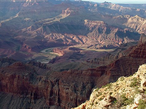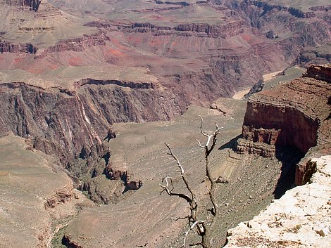 Heute war ein sch.... Tag. Erstmal unausgeschlafen aufgestanden, dann eine ziemlich lange Strecke gefahren. Und die war auch noch total eintönig, ewig geradeaus und karge Landschaft. Wir machten extra einen Umweg über Bullhead City, um einen Teil der Route 66 zu fahren. Obwohl genau dieser Teil in der AAA-Karte als lohnenswert markiert ist, wars total für die Katz. Außer einem kleinen Ort, wo Esel frei rumlaufen und einer schönen Landschaft war da nix Besonderes. Und die Straße war auch in keinem guten Zustand. Wahrscheinlich hätten wir doch erst bei Kingman die Route 66 fahren sollen. Dort sind wir dann aber wieder auf die Schnellstraße. Mussten ja auch vorwärts kommen. Beim Grand Canyon endlich angekommen, war der Zeltplatz natürlich voll, und morgen Nacht auch noch. Die schickten uns dann zum nächsten, 48 km östlicher. Sozusagen am Ostende des Canyons. Da war natürlich auch alles voll. Also ganze Strecke zurück und wieder zum südlichen Ende raus zu einem Platz 16 km außerhalb. Hier endlich bekamen wir Platz. O.k. etwas Schönes gabs doch, die ersten Blicke in den Canyon. Wahnsinn, jetzt mal das andere Extrem, bisher ging es immer in die Höhe, nun meilenweit in die Tiefe! Und auch hier wieder die Felsformationen! Die Farben! Bin mal auf morgen gespannt, wenn das Licht idealer ist. Nach Pellkartoffeln mit Quark zum Abendbrot sah dann alles schon wieder besser aus.