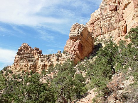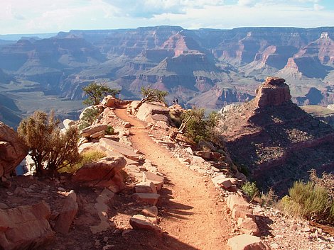 Gleich erstmal ein Tip, schaut Euch Grand Canyon im Sommer nie an einem Wochenende an. Wir standen gleich erstmal 1,6 km vor dem Nationalpark-Eingang im Stau! Ging dann aber verhältnismäßig schnell. Weiter wollten wir dann die Hermit Road, an der entlang einige Aussichtspunkte sind. Im Sommer ist diese für Autos gesperrt, dafür fährt dann ein kostenloser Shuttlebus. Bei dem standen die Leute natürlich auch wieder Schlange, aber wir wollten eh erst ein ganzes Stück den Rim Trail laufen, der auch an den Aussichtspunkten vorbei geht. Dies taten wir bis Abyss, das waren ca. 6,6 km. Von dort sind wir dann mit dem Bus zum Pima Point und dann die ganze Strecke zurück. Ja, was soll ich sagen, die Aussichten sind überall grandios. Aber am besten hat mir dann doch Trailview Overlook, Hopi Point und Pima Point gefallen. Und wie beschreibt man das Gesehene? Ich hab ja schon inzwischen alle möglichen Adjektive verbraucht. Ich habe aber festgestellt: man sagt ja, ein Fotoapparat hat nur einen begrenzten Blickwinkel, welcher nie dem des menschlichen Auges gleich kommt. Hier im Grand Canyon reicht nicht mal der Blickwinkel des menschlichen Auges, so weitreichend ist das Gebiet. Einige Formationen am Rand des Canyons erinnern vielleicht ans Elbsandsteingebirge. Lässt man aber den Blick weiter schweifen, sieht man eine Landschaft, die mit nichts zu vergleichen ist. Vor allem auch die verschiedenen Farben der Gesteinsschichten. Am späten Nachmittag sind wir noch zum Mather Point, auch sehr empfehlenswert, aber total überlaufen. Danach gings mal wieder bisle bergab. In der Nähe des Yaki Points sind wir den South Kaibab Trailhead 4,8 km bis zur Cedar Ridge gelaufen. Ging 350 Höhenmeter hinunter. Der Trail selber geht bis zum Colorado hinunter. Bietet wunderschöne Ausblicke und man ist den Felsen näher. Oft ist auch der Weg richtig rot von dem Gesteinssand. So ´ne kleine Wanderung sollte man hier auf jeden Fall machen, lohnt sich unbedingt. Zum Abschluss sahen wir uns noch den Sonnenuntergang beim Hopi Point an.