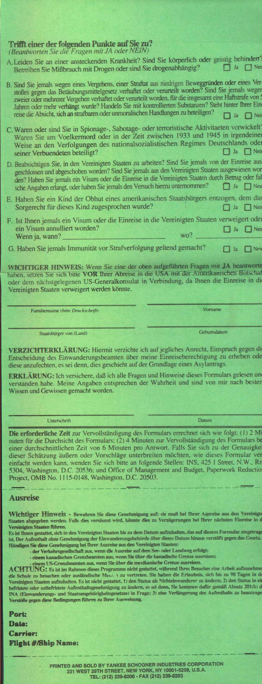 Eine gute Seite, um sich für den USA-Urlaub vorzubereiten, ist www.usatipps.de. Habe dort z.B. noch ein paar Infos zu den Einreiseformalitäten gefunden. Es wird empfohlen, schon beim Check-In ein Formblatt abzugeben. Außerdem muss man ja im Flugzeug 2 Formulare ausfüllen. Um sich darauf vorzubereiten, kann man sie hier schon mal betrachten. Desweiteren habe ich mich nochmal bei Hertz zwecks des 2ten Fahrers vergewissert, daß er im Preis inbegriffen ist. Wir sollen auf jeden Fall beide unsere ADAC-Mitgliedskarten mitnehmen.