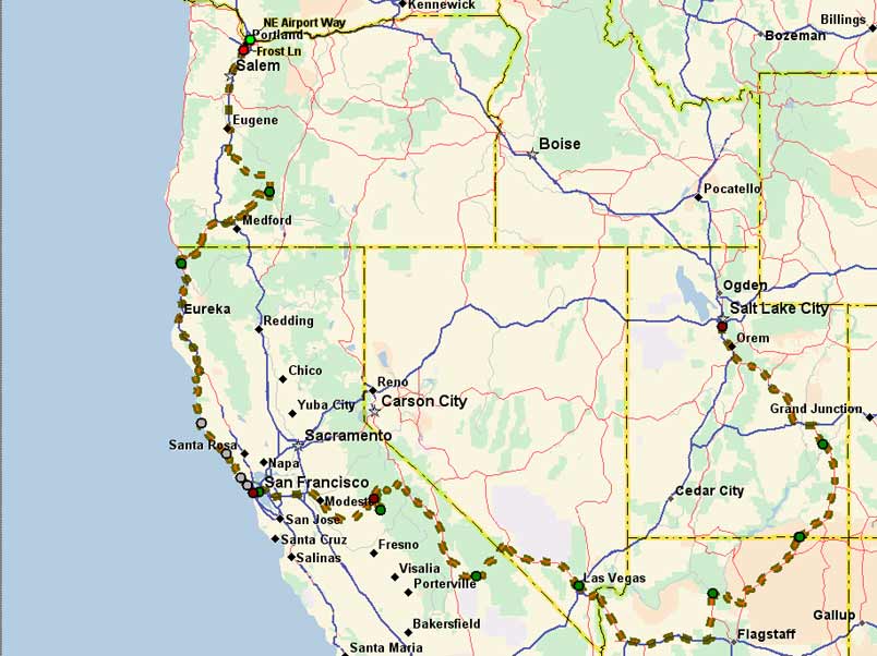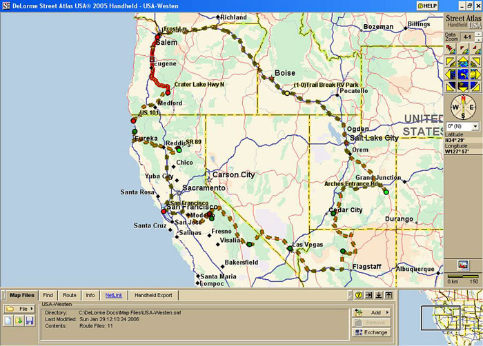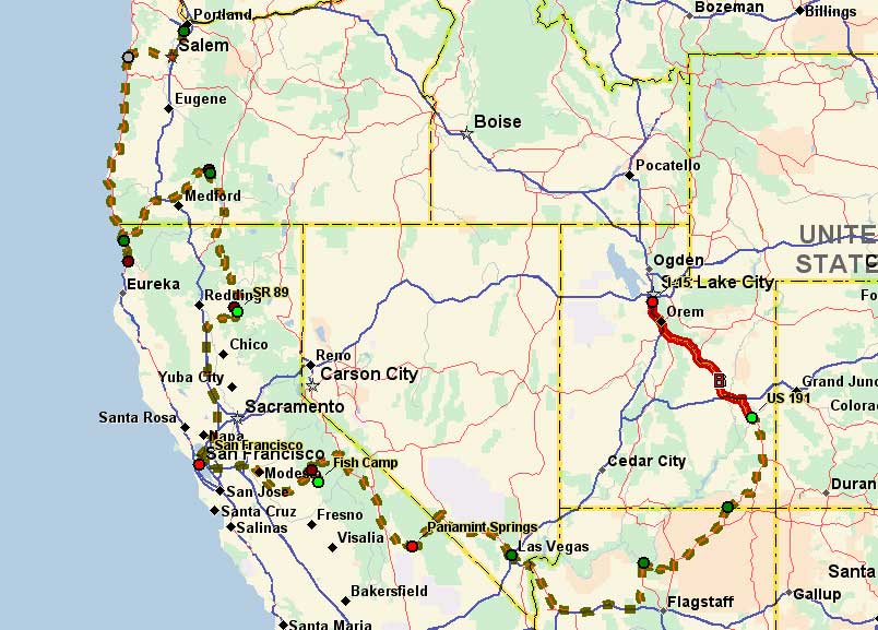 - Bis jetzt geplante Reiseroute: 1.Woche Aufenthalt bei Volker und Soni. Von dort aus Ausflüge zur Küste, zum Mount St. Helen, ein 2tages-Trip zum Olympia-NationalPark. Nach dieser Woche gehts los Richtung Süden zum CraterLake, dann zum Redwood, LassenVolcanic, SanFrancisco, Yosemite, DeathValley, LasVegas, GrandCanyon, Zion, BryceCanyon, Canyonlands und schlussendlich Arches. Von dort aus geht es über SaltLakeCity wieder nach Portland. Ich weiß, das ist wahnsinnig viel. Ich bin aber auch flexibel, falls wir nur die Hälfte von alldem schaffen, ist es auch o.k.. Andrererseits reizt mich der Nationalpark Arches schon ziemlich. Hier mal eine Karte mit den Routen.